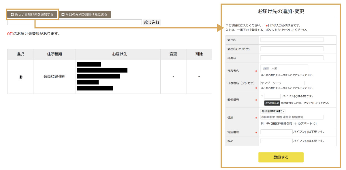 - 商品管理番号、商品番号、数量を入力しお届け先を選択