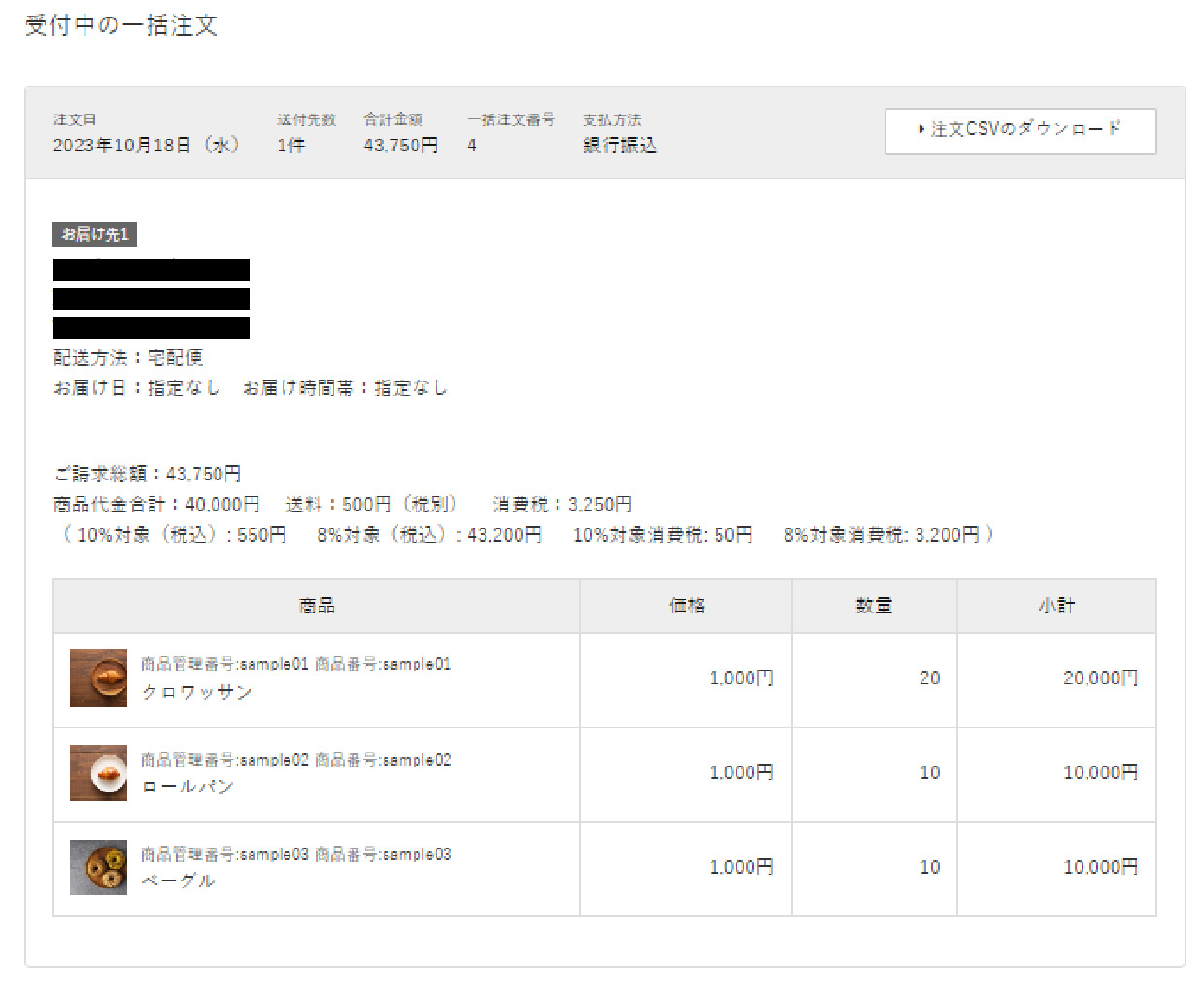 - 注文が完了すると、一括注文CSVアップロード画面で「受付中の一括注文」に表示されます。
