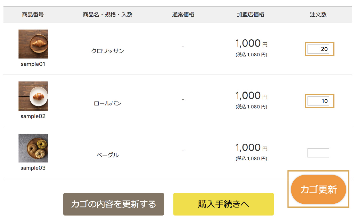 注文数入力の途中でも「カゴ更新」ボタンを押すと、オーダーシートに記入した内容でカートの内容が更新されます。