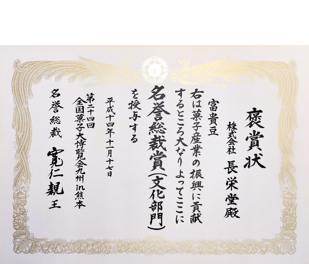 《平成14年第24回全国菓子大博覧会にて最高賞の「名誉総裁賞」を受賞した逸品≫